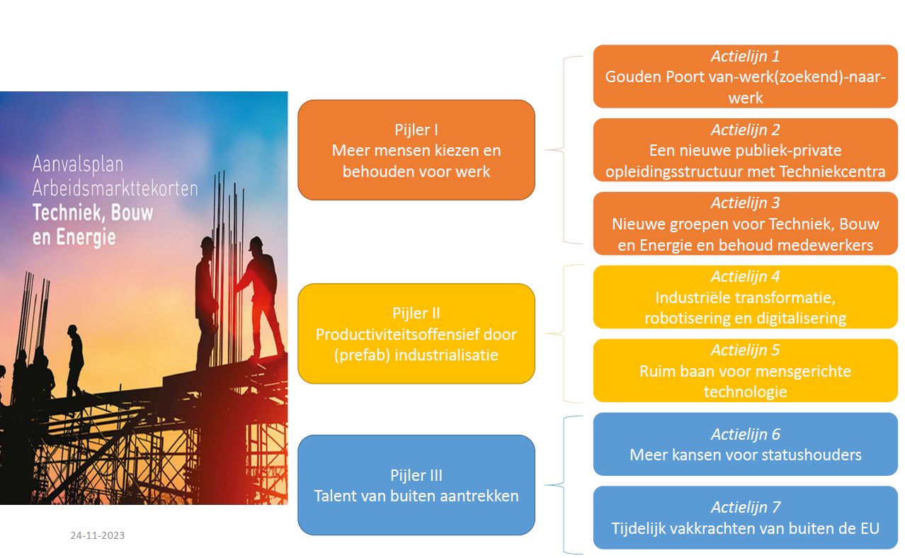 Het Actieplan Techniek kent drie pijlers met diverse actielijnen (zie afbeelding onderaan deze webpagina). De Gouden Poort, de eerste actie om te zorgen dat meer mensen kiezen voor techniek en er ook blijven, gaf het meeste rumoer bij de lancering van het Actieplan. Zowel in de regio als in andere sectoren: Er zijn al zoveel netwerken en initiatieven. Wat voegt die Gouden Poort toe en hoe gaat dat alles verbinden? Heij benadrukt dat de sector zichzelf moet aanrekenen dat er nog zoveel mensen de techniek verlaten. De enige oplossing daarvoor is samenwerken, met zes sectoren: ‘Dat kost tijd. Want hoe vinden we elkaar in die versnippering, hoe krijgen we het overzichtelijk en ook transparant? Daarvoor is een langjarige commitment vereist, dat heb je niet in één keer voor elkaar. We moeten structuren vinden om met die technische arbeidsmarkt om te gaan en de partijen daarin te verbinden. We willen niet van incident naar incident gaan’. Dat laatste werd beloond met applaus uit de zaal.